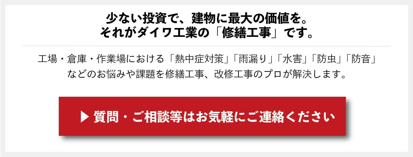 工場や倉庫の修繕や改修を請け負うダイワ工業では、射光ネットの設置など熱中症対策の提案が可能です。現場調査から最適な提案まで一貫して対応します。
