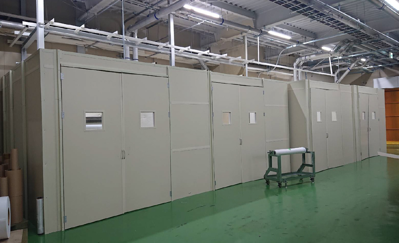 例えば、実例のT社様で使用している防音ボックスは、岐阜プラスチック工業の特許品である防音材「セイント」を使用しております。鉄のように錆が出ることなく、ベニヤ板のように腐食する事もありません。また私どもでは、設置工事の際に「土足ではなく上履きを履く」「作業着の上から防護服を着る」「粉塵を出さない」「火を使わない」などの自主管理のもと、お客様の現場衛生に配慮させて頂いております。